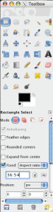 To crop, I usually select the area I want to keep, and then crop. First, select the Rectangle Select Tool in the Toolbox in the upper left. I like to use an additional setting to help me keep the crop in proportion with the original image – in this case it’s a vertical photo so I’m going to select “Fixed Aspect Ratio” on the lower right of the Toolbox and insert 36:54 (width:height) for my image (or 2:3). [Note: this ratio will not work for images from every camera – check your own image ratio]