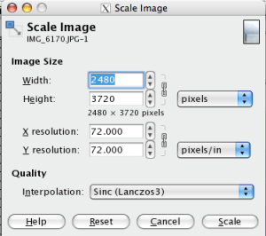 And here’s the dialog box. Note that the “chain link” is linked by default, meaning that GIMP will retain the proportions of the image (i.e., an image that is originally 200×100 will reduce to 100×50, etc.) If you need to resize to a specific size (i.e., 100×37) you’ll want to click on the chain to remove the proportion constraint. Also pixels is the default denomination – you can also choose inches or percent to reduce the image by 50%, etc.