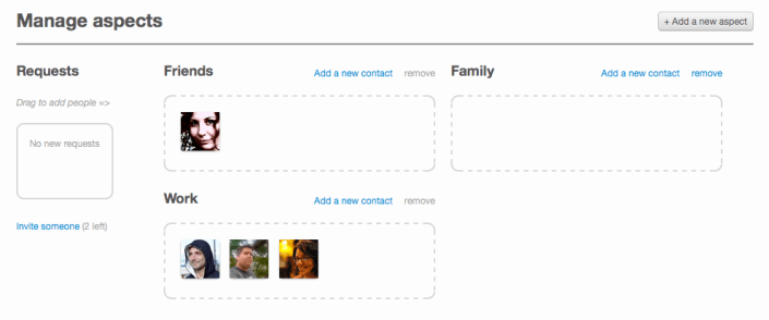 Managing aspects – you organize your contacts into “aspects” – this drag-and-drop approach is interesting but I think it will not scale when I’m managing hundreds of contacts. They start you with two aspects – Family & Work, and you can create and add as many aspects as you desire.