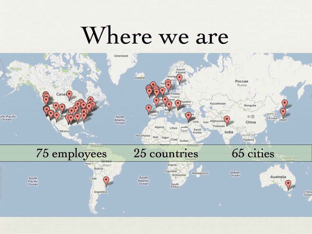 Automattic is a distributed company, with 75 employees in 25 countries and 65 cities. The highest concentrations of employees is in the San Francisco Bay Area, where we have a Lounge that is not an office but an occasional event and meetup location. The second-highest concentration of Automatticians is in Sofia, Bulgaria (4).