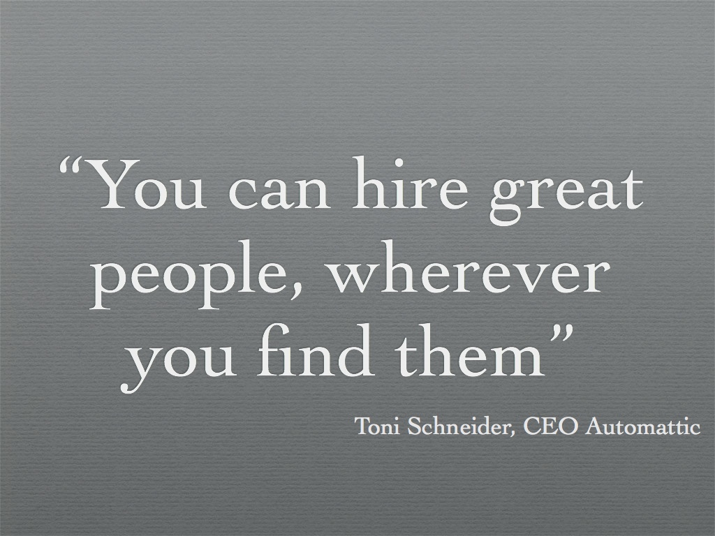 The first point is “Be distributed.” The subtext of this slide is that the definition of a company is changing: it is no longer an office, a set of desks, and meeting rooms. The company is how and where you make it, and having a distributed company is more appealing than ever.