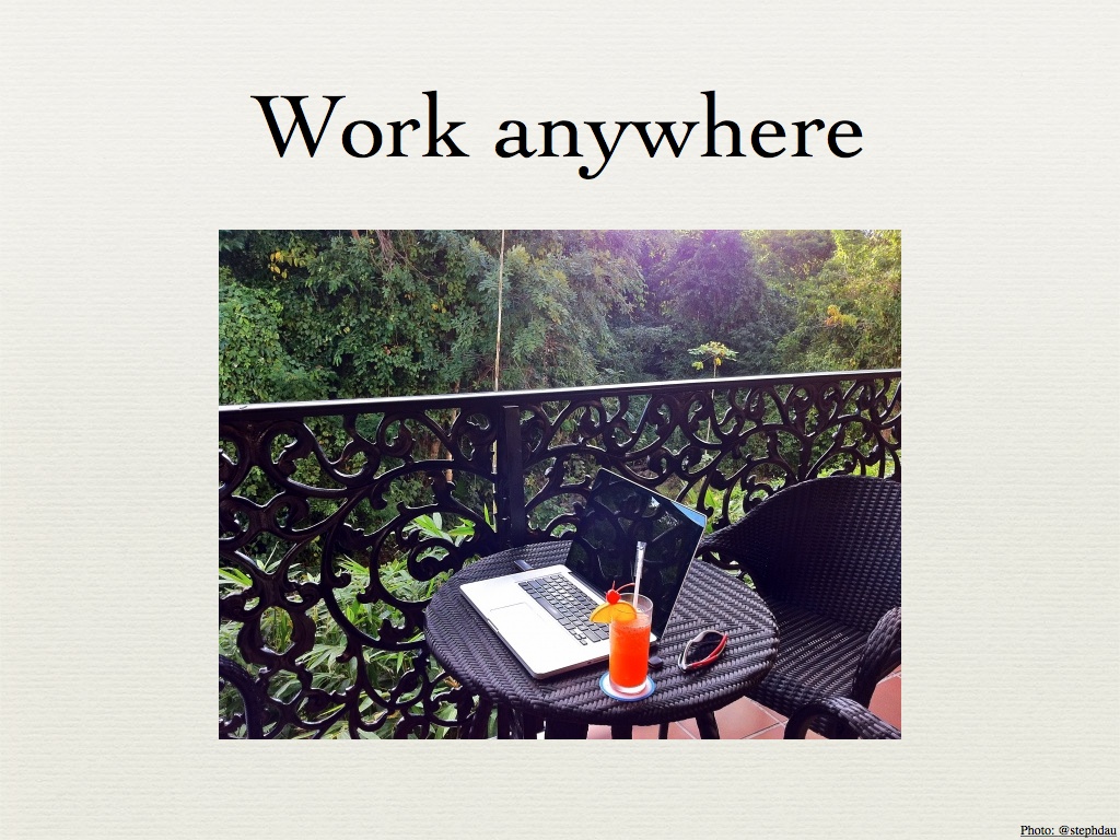 Further still is the freedom a distributed company allows the employee to construct his/her work environment, from the location to the timing. The concept of: being in the office = productiveness is no longer applicable, and the flexibility allows the employee to work when they feel more productive, to take breaks when they aren’t, and experience other environments if desired. Of course, this has to be balanced with the demands of clients if the worker is client-facing, and also if the employee prefers to be around when the bulk of the company is online and tranascting business (many do, and adjust their schedules accordingly no matter what time zone they live in).
