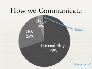 This is one of my favorite graphs which illustrates how a digital company can communicate internally – most of our communication happens on internal blogs, followed by IRC (a private company chat), Skype for personal, 1-on-1 communication, and a small percentage for email, which is mainly outgoing with clients.