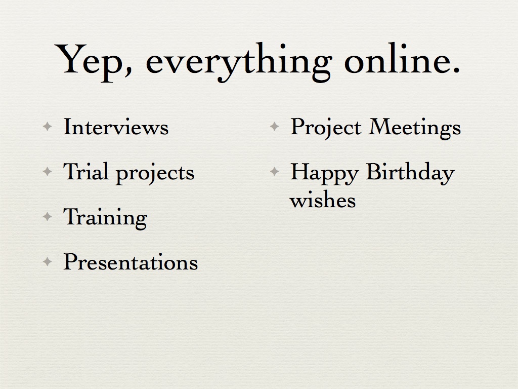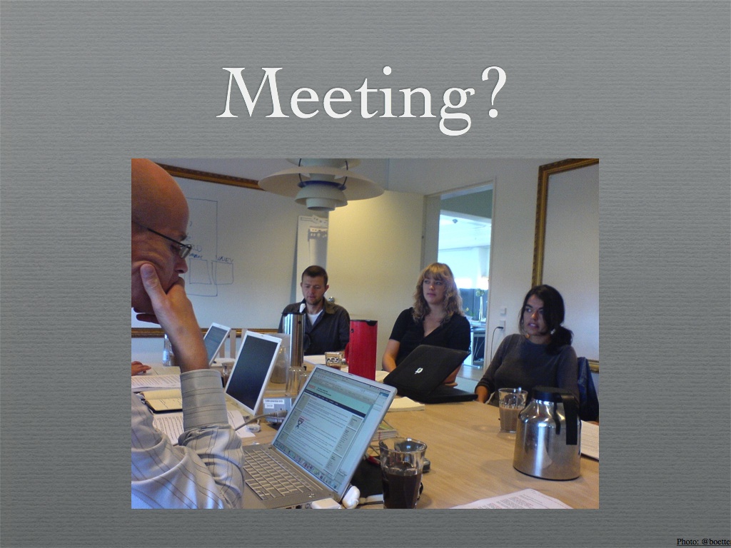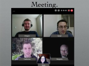 Our meetings, when we actually have them, look more like this – different parts of the world connected by Skype for brief moments. Thanks to Skype video we see each other, too, but our team meeting is once a week and more about talking about things we didn’t discuss online and generally hearing how everyone is doing, outside of work, too. It’s more of a human meeting than one with action items, and we try to keep it short, just 30 minutes. Everything else is a non-meeting.