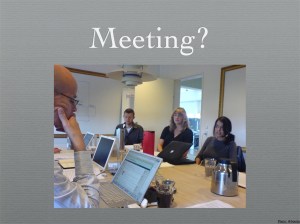 Here’s a picture of a traditional meeting – 6 people sitting around a table with computers open, dazed looks on their faces, and surely they’ve been in this meeting much longer than necessary.