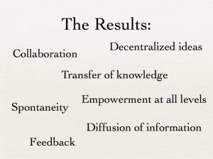 I think the results are obviously more important – it creates a collaborative environment where discussions can happen in real-time, from any part of the company, and results in a lot of distributed ideas, instant diffusion of information, and the ability to contribute at any level. The downside of having all this information is that it can be too much noise but there are a lot of ways to combat this including limiting one’s subscriptions to only the most applicable blogs, filtering messages and content based on keywords, and receiving alerts any time your name or a keyword you follow (like your product or team name) is mentioned on any of the blogs.